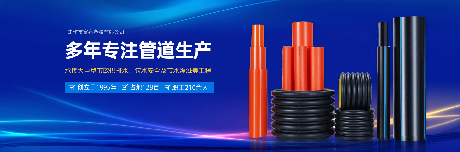 - 焦作市富泉塑膠有限公司,創立于1995年,是一家集研發、設計、生產、銷售為一體的大型管材企業。公司位于太極故里、黃河之濱一一河南焦作溫縣。公司占地128畝,現有職工210余人,其中具有中技術職稱的19人。生產、檢驗設備58臺(套),包括PVC實壁管生產線11套、PE實壁管生產線12套、HDPE雙壁波紋管生產線6套、PVC雙壁波紋管生產線5套,檢驗設備14臺(套)。主要產品有:Φ20mm-630mm、各種壓力規格的PVCU、PVC-M、PE給水管材,PVC-U節水灌溉管材,HDPE燃氣和礦用管材,DN200-800mm的HDPE、PVC雙壁波紋管及各種噴灌、滴灌工程材料。承接大中型市政供排水、飲水安全及節水灌溉等工程。 富泉塑膠公司重視產品的質量、安全、環保和節能,在同行業中率先完成了“新華節水產品認證”,全方面通過OHSAS18001職業健康安全管理體系的一體化導入,并建立起規范的現代企業管理體系。公司以“質量”為先導,采用質量跟蹤、多環節把關的方法,組建具有行業水準的企業技術檢測中心,常年委托水利部節水灌溉設備檢測中心、河南省產品質量監督檢驗院對產品跟蹤檢測,并由中國人民保險公司承保產品質量。公司連續多年被河南省水利廳確定為“安全飲水設備、節水灌溉設備”定點生產企業,并獲得“中國名優產品”“質量、服務、信譽AAA企業”“河南省**產品”“河南省水利企業”“河南省守合同、重信用企業”等榮譽稱號。 富泉塑膠公司堅持“用戶為上”的服務理念,長期以來,全方面關注客戶價值,不斷提升服務水平。服務隊伍常年為客戶的產品設計、施工、安裝提供合理的方案和全程細致、周到、**、快捷的技術服務。公司自成立以來,一直堅持以人為本的宗旨,塑造企業形象,并致力于新產品的開發,憑借雄厚的技術開發能力,先進的工藝制造流程,嚴格的質量管理保證體系,優良的售后服務網絡,已成為河南省大的飲水、灌溉及排水管材設備制造商。產品暢銷全國,而且還以公司雄厚的綜合實力在業界中占據著重要的地位。